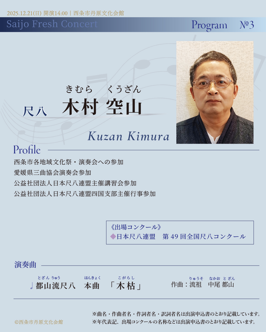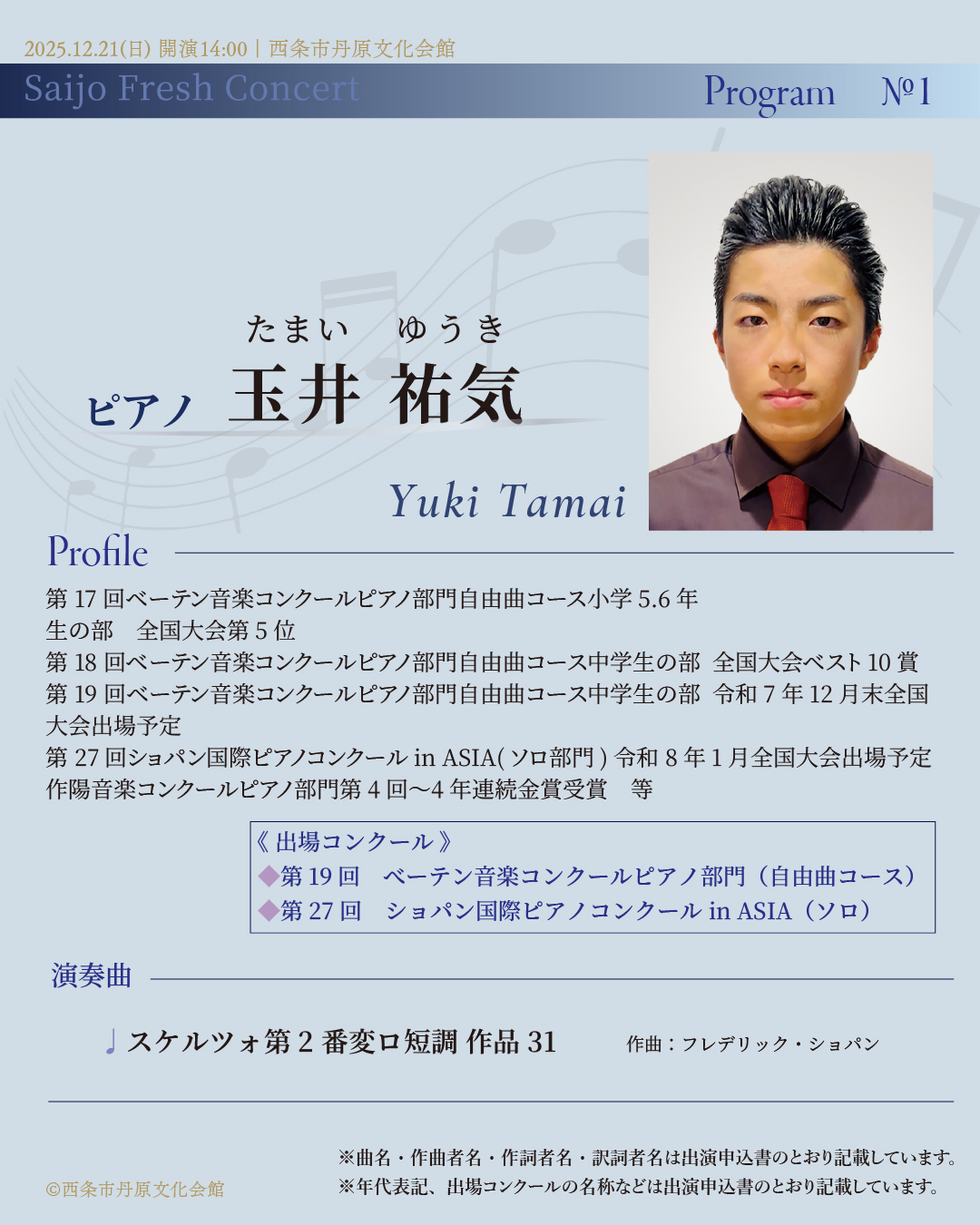| 開催日時 | 2026年3月15日(日)開演14:00(開場13:00) | 会場 | 西条市丹原文化会館 大ホール |