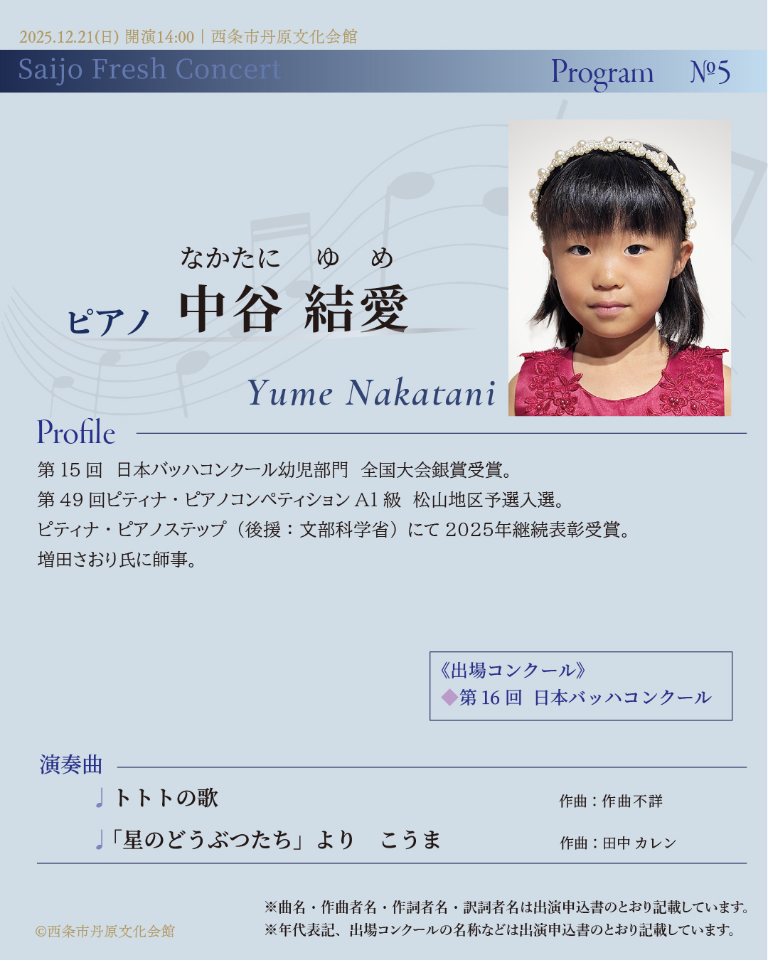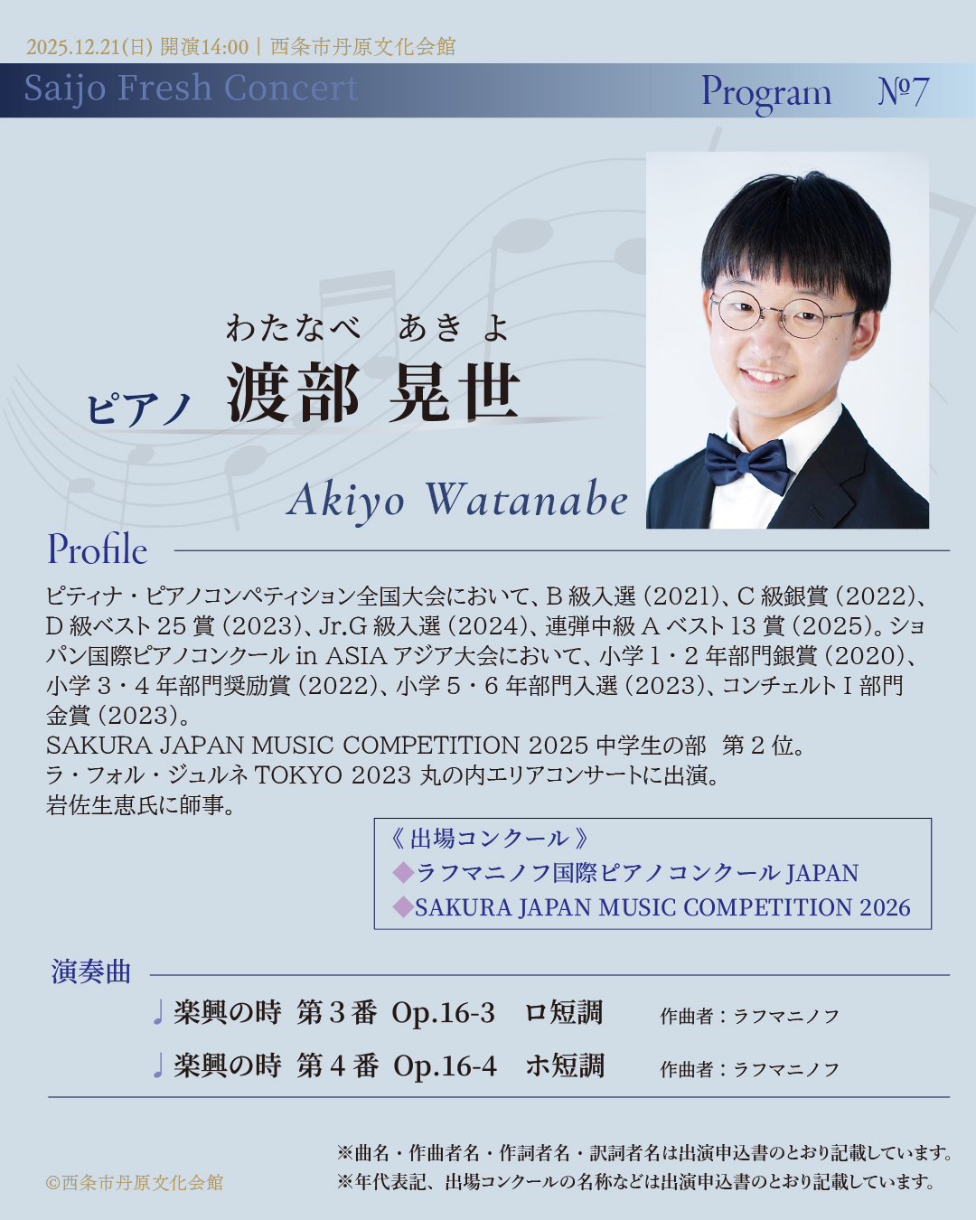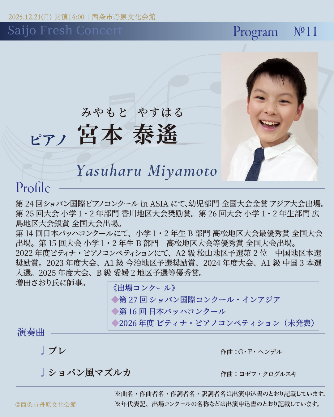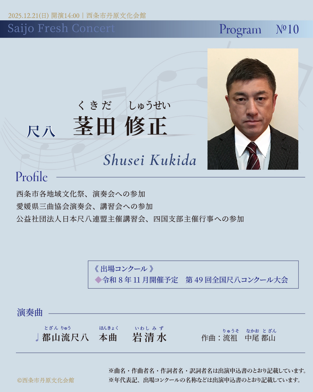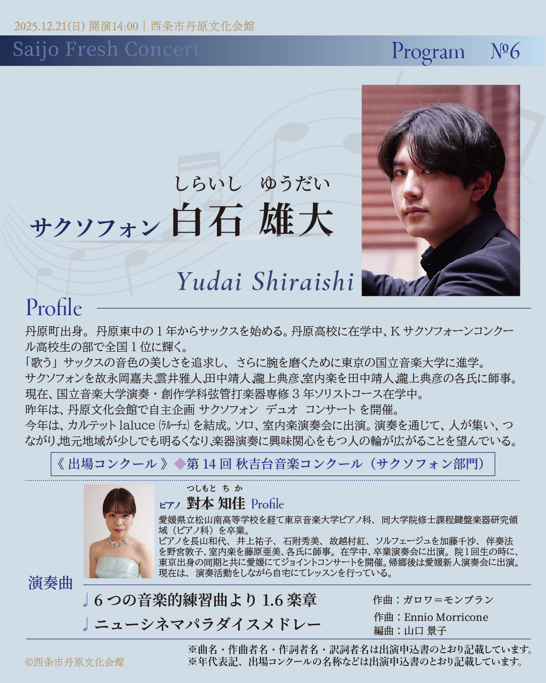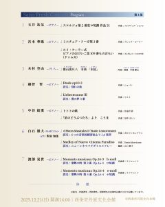 | 1.玉井 祐気 —ピアノ― 2.宮本 華歌 —ピアノ― 3.木村 空山 —尺八— 4.越智 哲 —ピアノ― 5.中谷 結愛 —ピアノ― 6.白石雄大 —サクソフォン― 對本 知佳 -ピアノ- 7.渡部 晃世 —ピアノ― |
