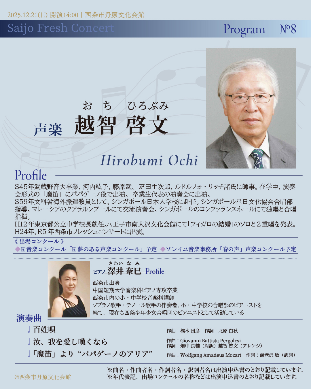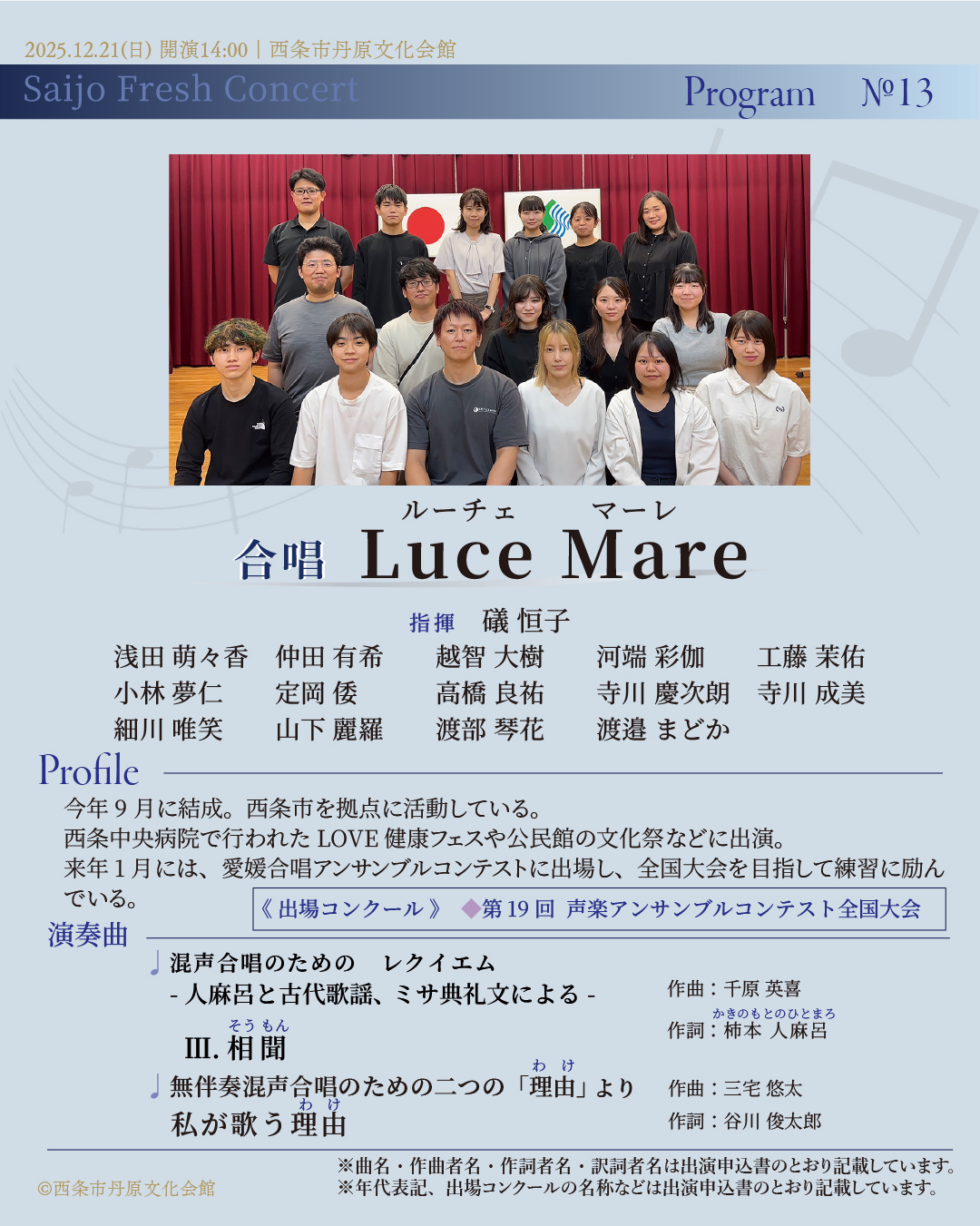 8.越智 啓文 —声楽— 澤井 奈巳 -ピアノ- 9.出久根 文人 —ピアノ― 10.茎田 修正 —尺八— 11.宮本泰遙 —ピアノ― 12.和田德香 —ピアノ― 13.Luce Mare —合唱— |